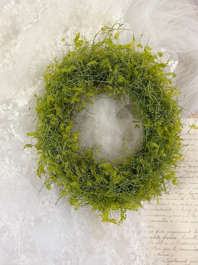 Φ22〜24cm H8〜10cm ふわふわとしたグリーンと小花達を合わせて、野原に咲く草原のような…爽やかなリースを仕立てました。 グリーンの主体となる花材=サンウィーバインの繊細な葉や茎に動きがあり、見る角度によって、表情が異なります。 爽やかふわふわリースをお部屋に飾ってみませんか? 1つ1つ丁寧に手作りしています。 *花材* サンウィーバイン・ミニかすみ草(数種類)・アジサイ(グリーン)・土台(ツル) **プリザーブドフラワー・ドライフラワーの取り扱いについて 高温多湿・直射日光に注意してお飾り下さい。 プリザーブドフラワー・ドライフラワーは、とてもデリケートで葉や花びら切れを起こしやすい花材です。長く楽しんで頂くためにも取り扱いにご注意下さい。水やりをする必要はありません。 プリザーブドフラワーは生花に特殊加工をしてあるお花です。その為、鮮やかな色と生花の風合いをお楽しみ頂けます。布などに長期間接する事で染料が色移りすることがありますのでご注意下さい。 ドライフラワーは生花を乾燥させたお花です。生花と同じようにその季節毎・乾燥具合で花の形や色の状態が変わります。また時間の経過と共に色が変化して行きますので自然の風合いとしてお楽しみ下さい。 ***サンウィーバインについて*** とても繊細な葉とツルの植物です。 葉が薄いため切れやすく、落下しやすいことをご了承ください。室内の環境や湿度等、また経年による色目も少しずつですが変化いたします。 天然の素材であることをご了承ください。 *一緒に撮影している小物はイメージで非売品です。販売価格の中には含まれておりません。 *プレゼント対応しております。お問合せ下さい。(メッセージカードはお付けしておりませんが、対応可能ですので御注文時にお問い合わせ下さい。)