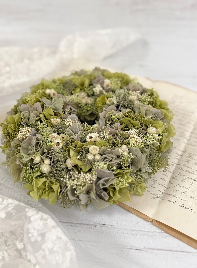 Φ26〜27cm H 7〜8cm 落ち着いたアンティークカラーのグリーン達と白い小花達を 合わせて、リースに仕立てました。 幅広のリースはしっかりとボリュームがあり、存在感があります。 お部屋のインテリアとも相性よく、華やかでありながらも 控えめな印象にもなります。 壁にかけて飾って楽しむ…またはお気に入りのお皿の上に置いたり、ちょっとしたスペースに直に置いてリボンや枝物と一緒に飾っても素敵です。 アンティークの小物達とも相性が良いので、お待ちの物と並べて飾ってみて下さい。 *花材* アジサイ2種類・ミニソフトかすみ草7種類・ライスフラワー・エバーラスティングスニージーズ・リース土台(ツル) 〜長く楽しんで頂くために〜 *プリザーブドフラワー・ドライフラワーについて 高温多湿・直射日光に注意してお飾り下さい。 プリザーブドフラワー・ドライフラワーは、とてもデリケートで葉や花びら切れを起こしやすい花材です。長く楽しんで頂くためにも取り扱いにご注意下さい。水やりをする必要はありません。 プリザーブドフラワーは生花に特殊加工をしてあるお花です。その為、鮮やかな色と生花の風合いをお楽しみ頂けます。布などに長期間接する事で染料が色移りすることがありますのでご注意下さい。 ドライフラワーは生花を乾燥させたお花です。生花と同じようにその季節毎・乾燥具合で花の形や色の状態が変わります。また時間の経過と共に色が変化して行きますので自然の風合いとしてお楽しみ下さい。 *一緒に撮影している小物はイメージで非売品です。販売価格の中には含まれておりません。 *プレゼント対応しております。お問合せ下さい。 *メッセージカードはお付けしておりませんが、対応可能ですので御注文時にお問い合わせ下さい。