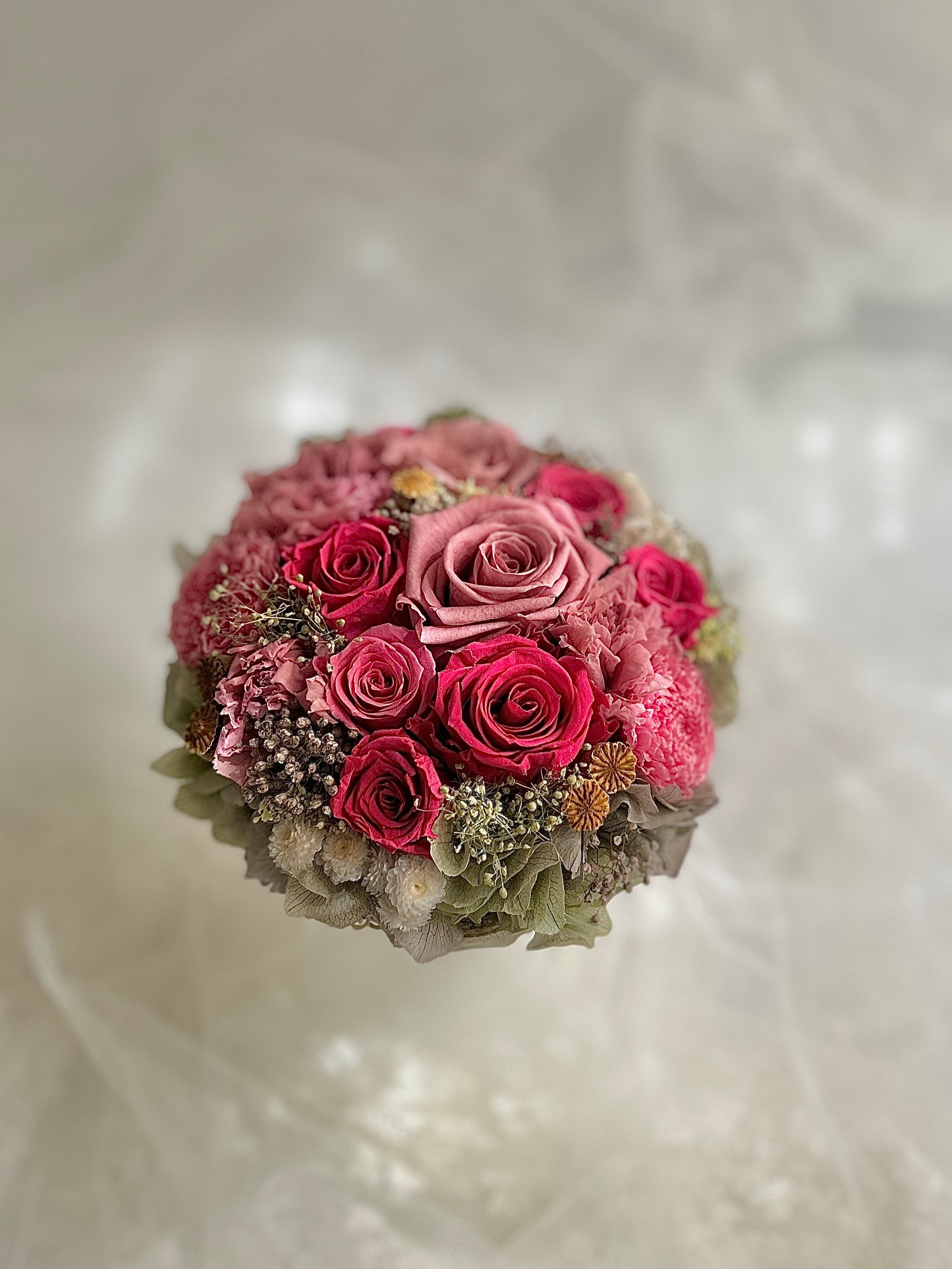 ・プリザーブドフラワーは生花に特殊加工をしてあるお花です。その為、鮮やかな色と生花の風合いをお楽しみ頂けます。布や壁などに長期間接する事で染料が色移りすることがありますのでご注意下さい。