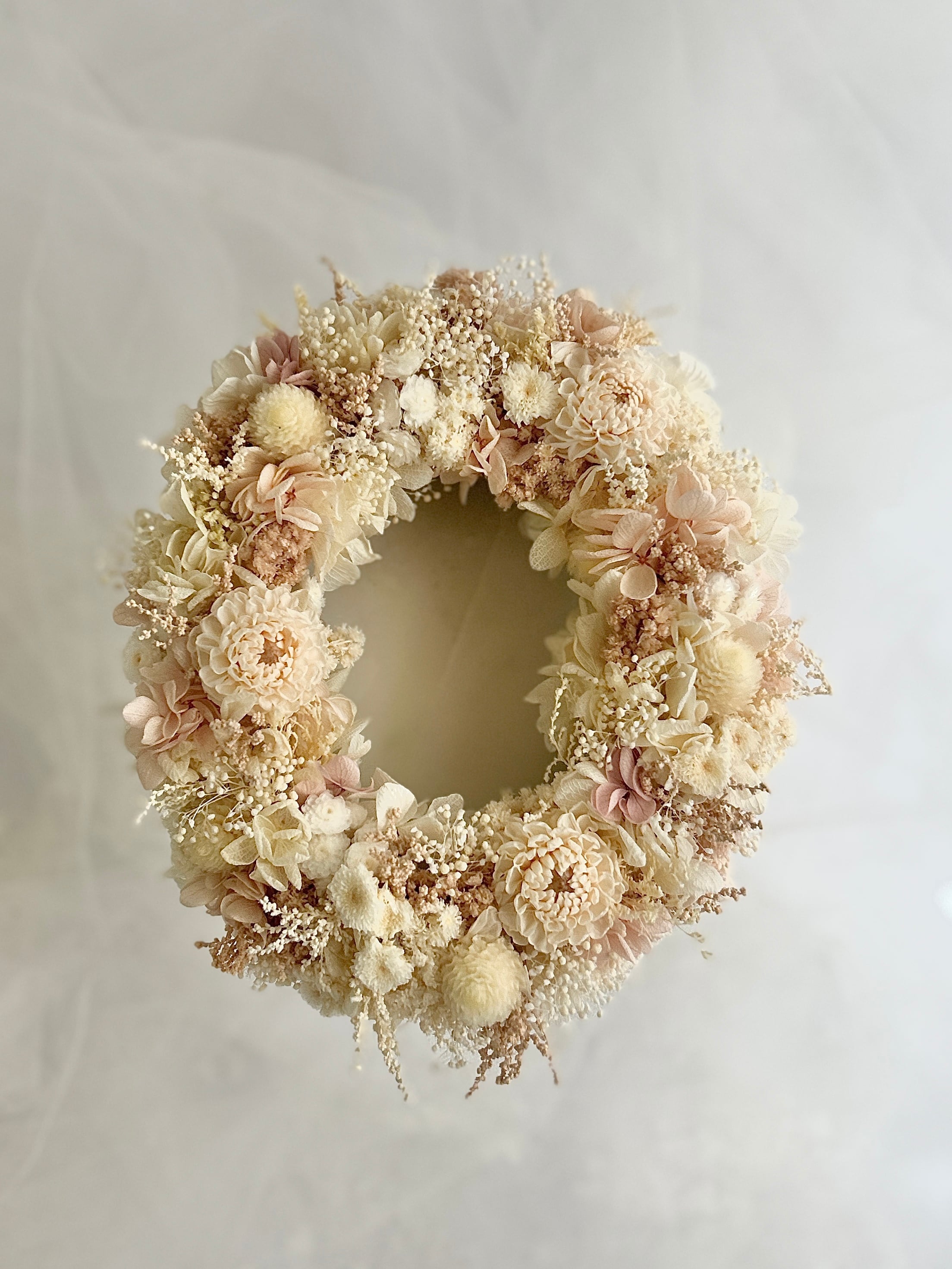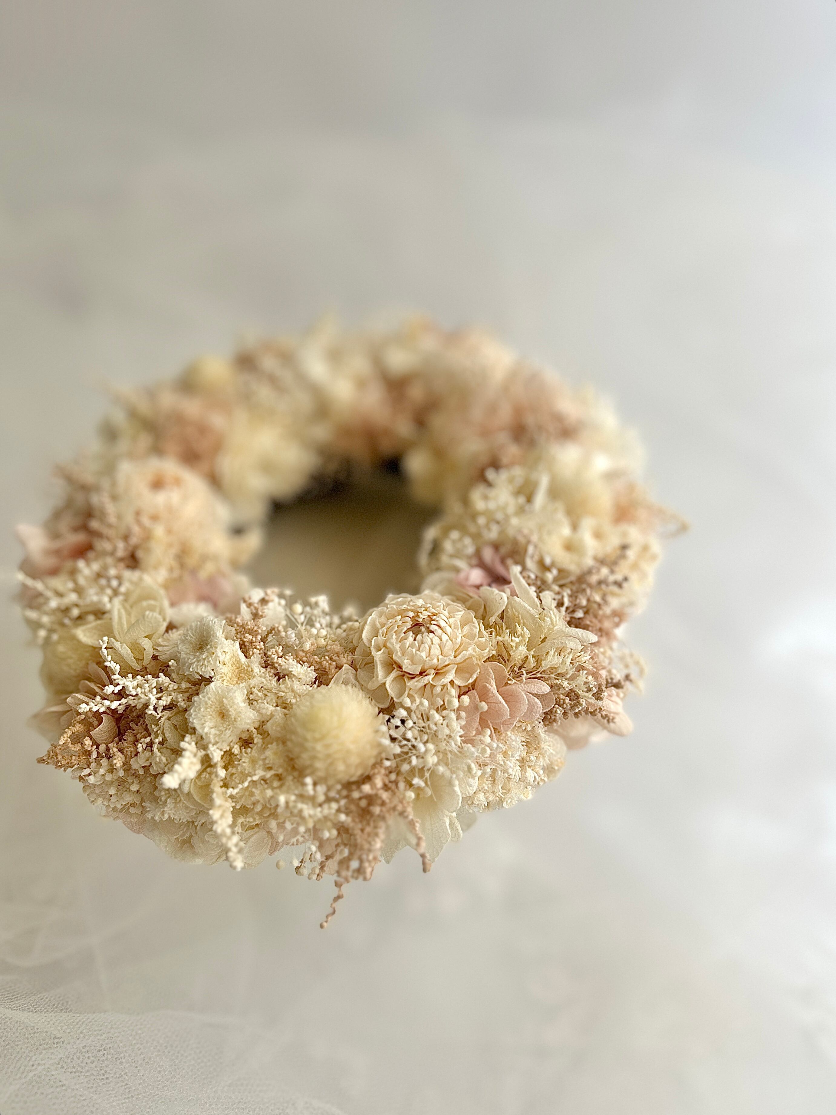 オフホワイトからパステルピンクや少しくすんだピンクを彩り、グラデーションの可愛いらしいリースに仕立てました。