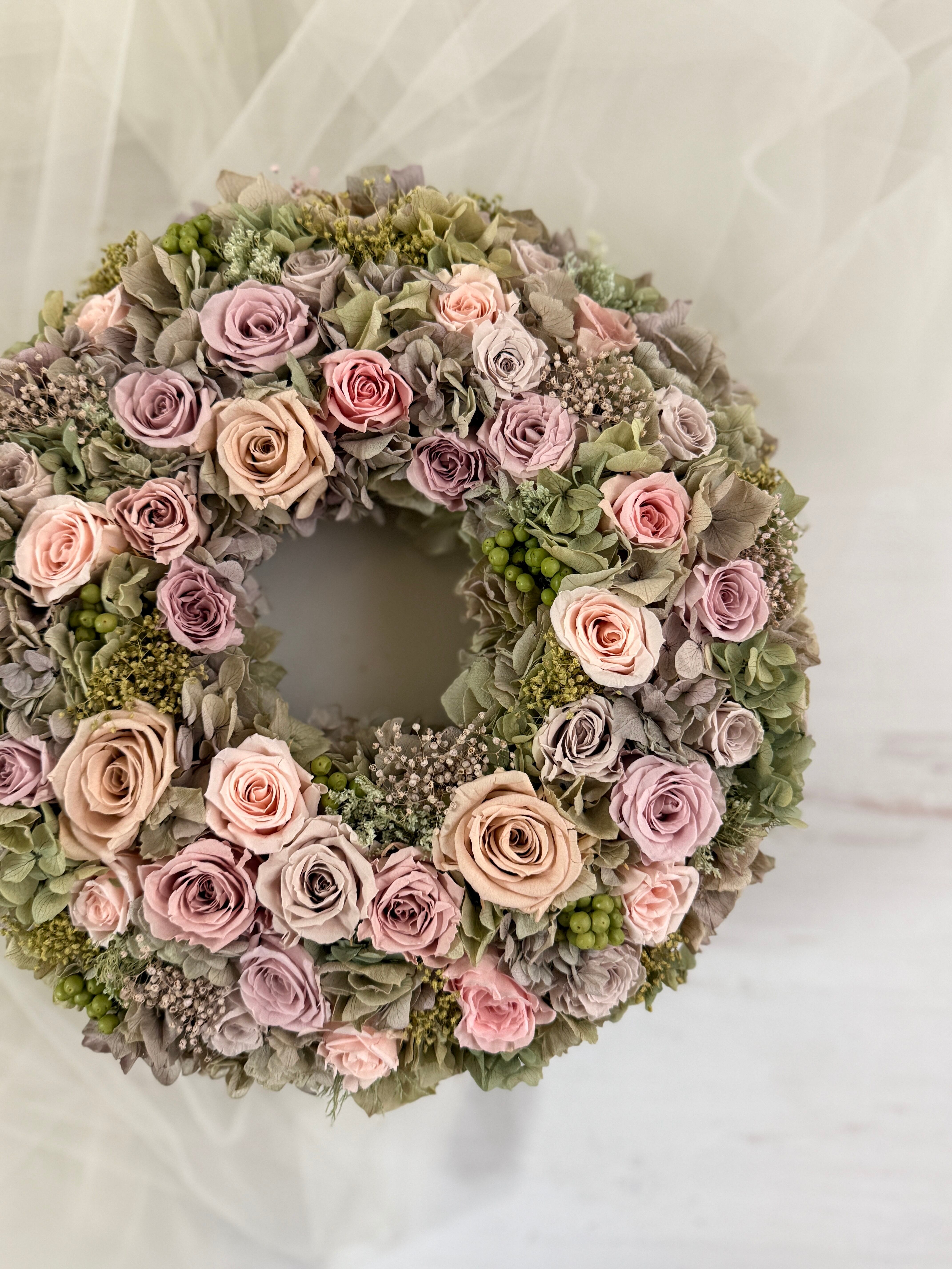 またアジサイ達の絶妙な色達が、バラ達に優しく寄り添っている…そんな印象のリースです。