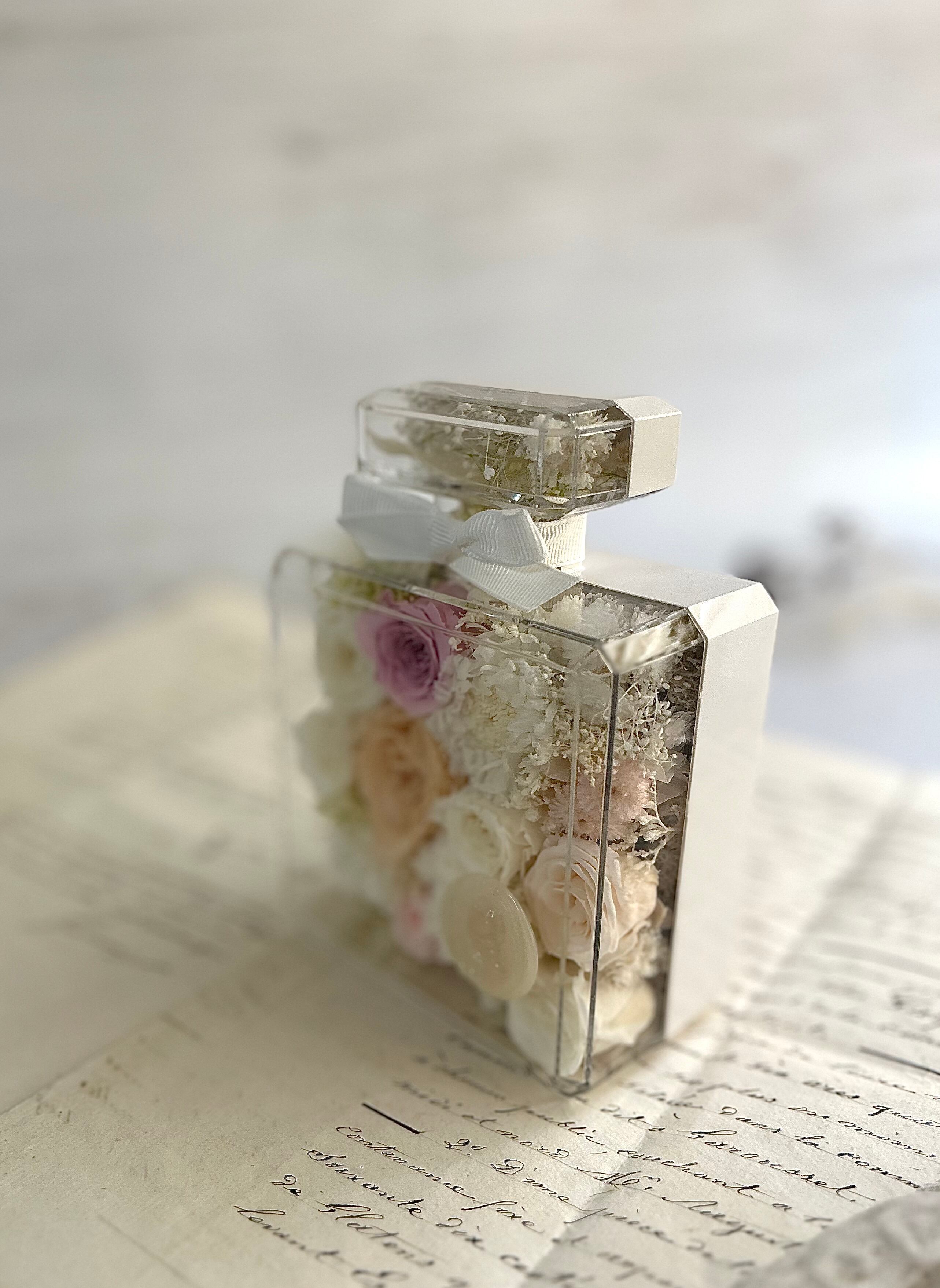 バラ数種類・アジサイ(数種類)・ミニソフトかすみ草・イモーテル・アスター・クリスパム・香水型ボトル(アクリル製)